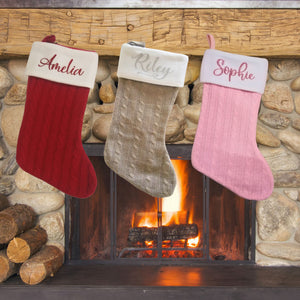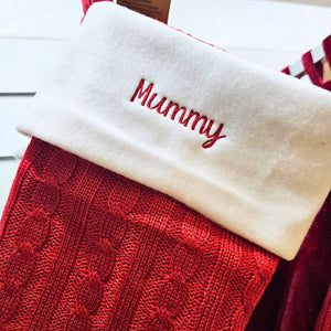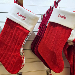 You can choose your stocking colour from the traditional Christmas Red, Grey, or Pink. Each knitted Xmas stocking is finished with a white velvet band to the top of the stocking, with your personalised name along the top in your choice of either vinyl or embroidery.