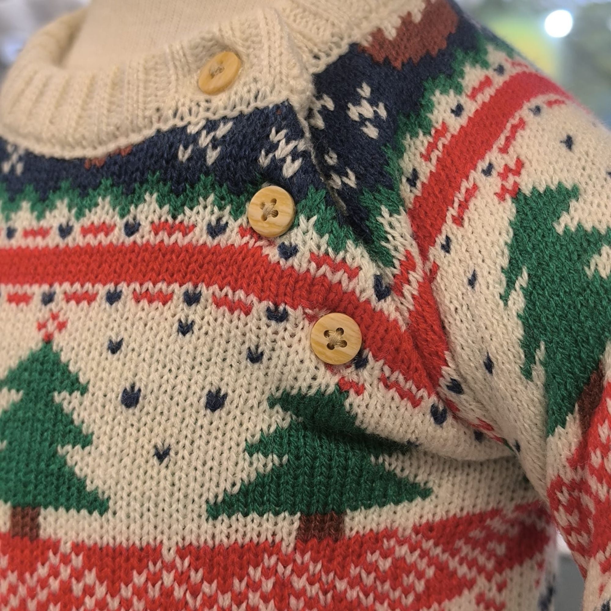 The romper is made from a comfortable blend of 50% polyester and 50% acrylic, which includes recycled polyester, offering warmth and softness for your baby throughout the festivities. The design is finished with a ribbed collar, cuffs, and legs, and features small, stylish details like wood-effect buttons on the collar and legs.