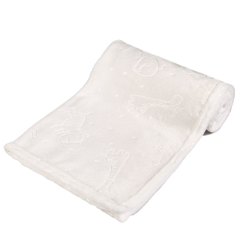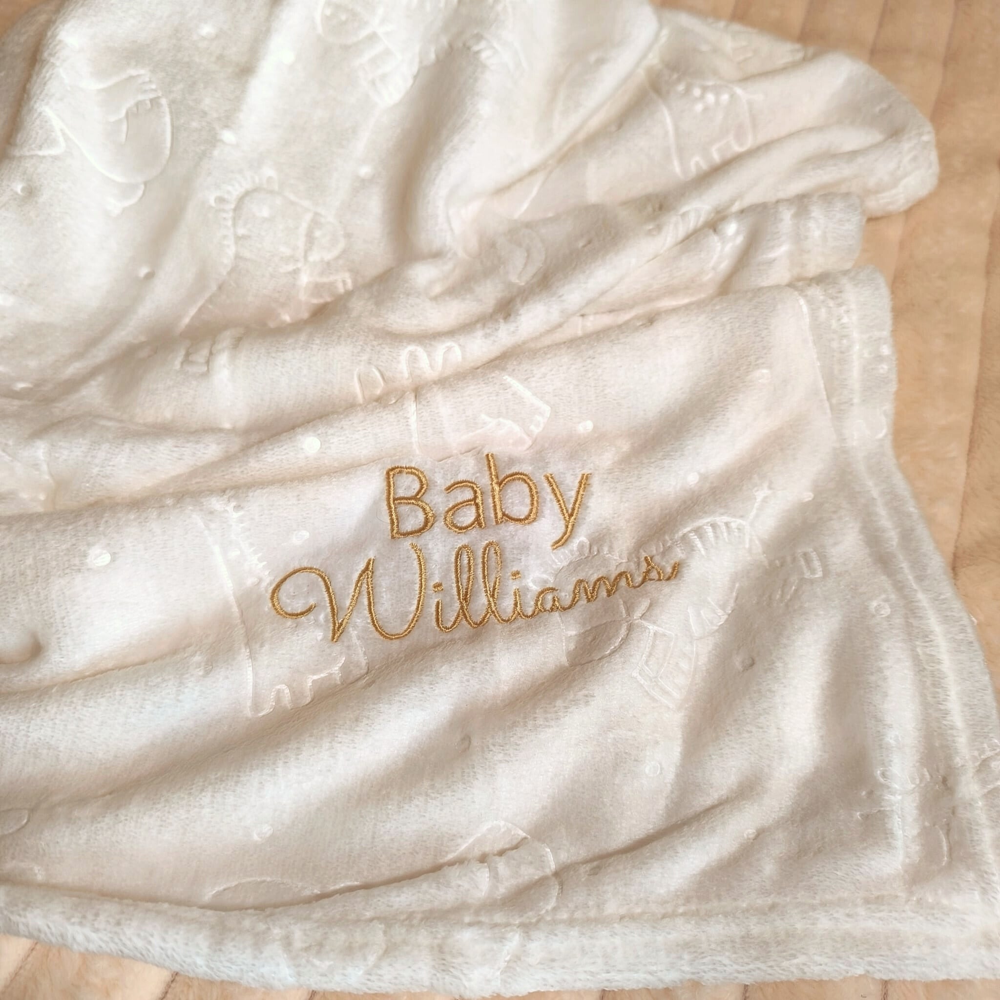 A gorgeous and soft personalised blanket featuring an embroidered name and a subtle safari animal embossed design features giraffes and zebras. This super soft white blanket is made from 100% polyester, and you can make your embroidered blanket truly unique with your choice of baby name embroidered on the front in your choice of font style and thread colour. The perfect white baby blanket that will make a perfect new baby gift, christening gift or baby shower gift.