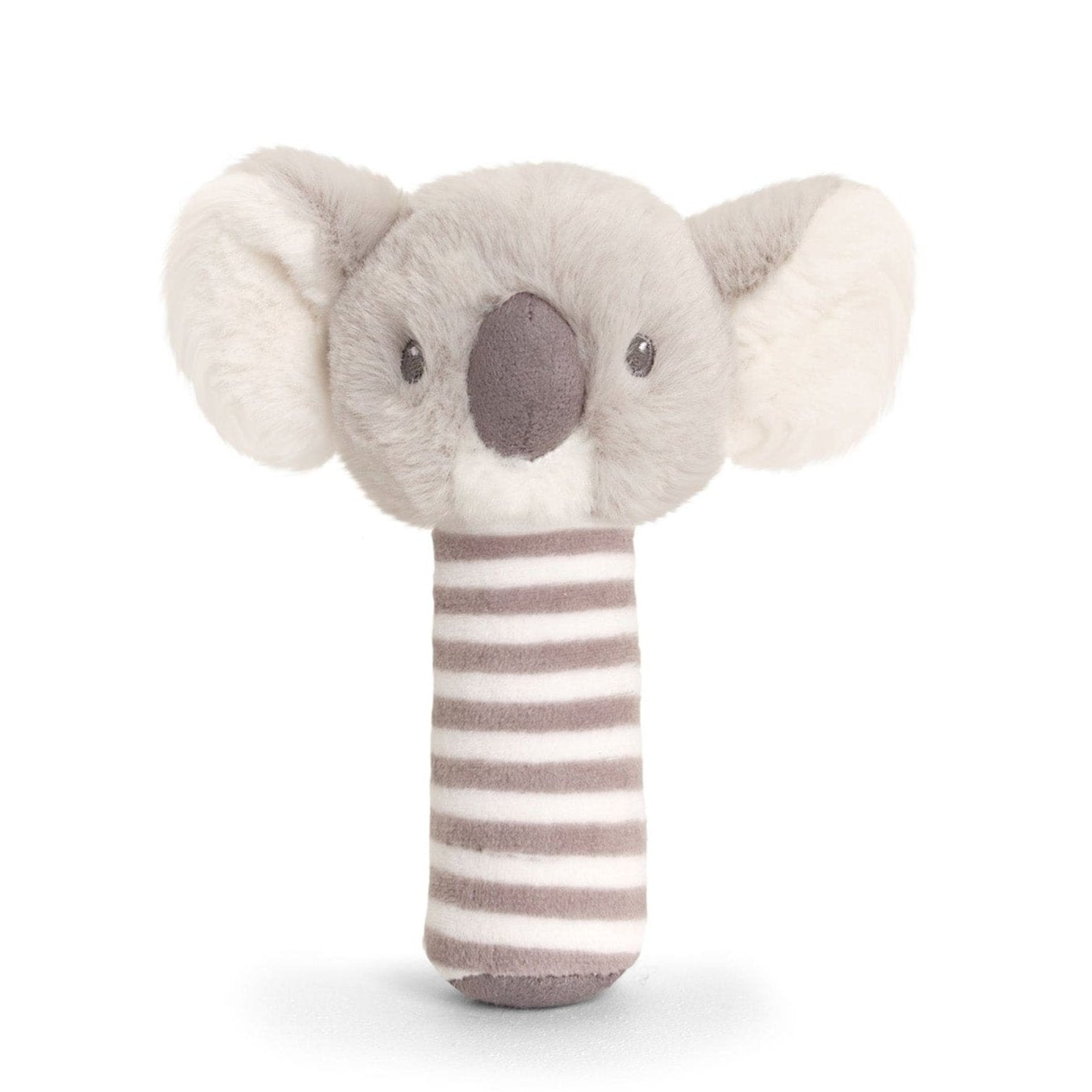 This Koala stick rattle is made up in grey and cream, with them combined in stripes for the velour body and used in contrast on the fur head to highlight its mouth and flappy inner ears that provide additional interest. Thread embroidered grey and white eyes ensure the product is suitable from Birth.