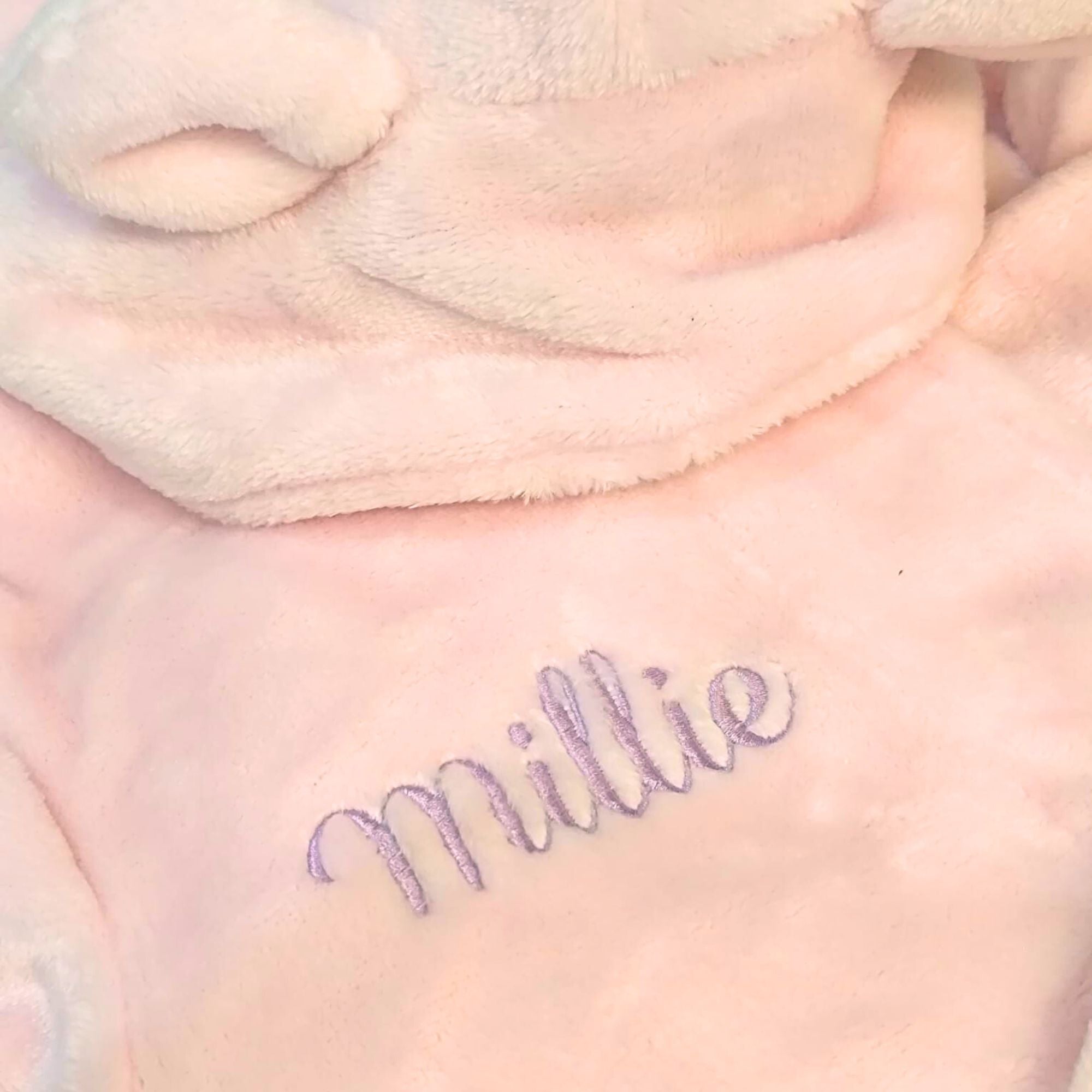A soft and cuddly personalised baby dressing gown with cute Bear Ears on the hood with an embroidered name on the chest. Our gorgeous personalised baby robes are super soft and very cosy and are made to the highest quality. These children’s dressing gowns are made from 100% polyester plush fleece and are soft and gentle against your new baby's skin. Our baby bath robes will make the perfect new baby gift, or can be the special baby shower gift.
