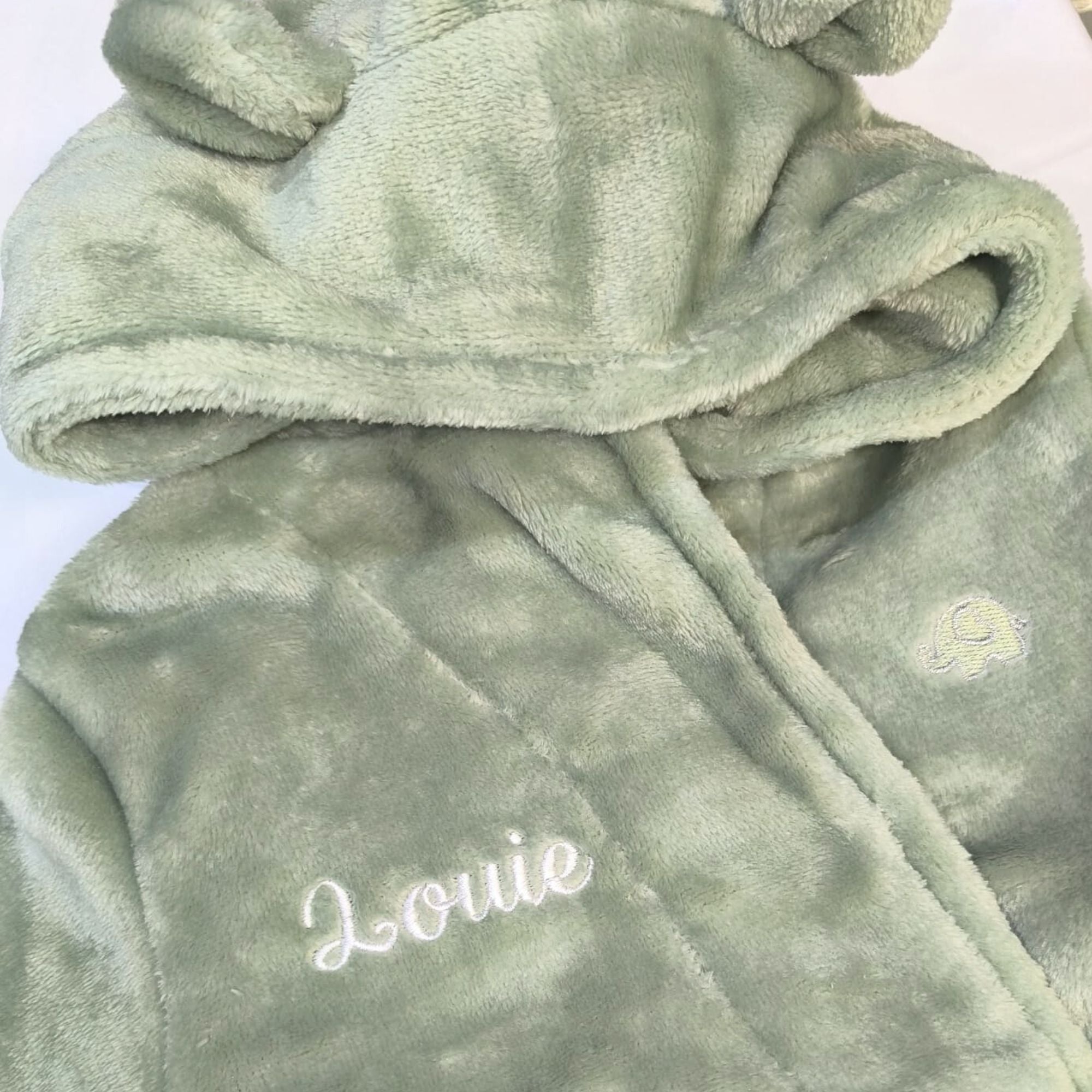 Our soft baby bear ear dressing gowns can be personalised with your choice of name or initials on the right chest. The left chest will feature a small embroidered motif such as an elephant or bear. Each of our baby robes can have a custom name of up to 10 letters.