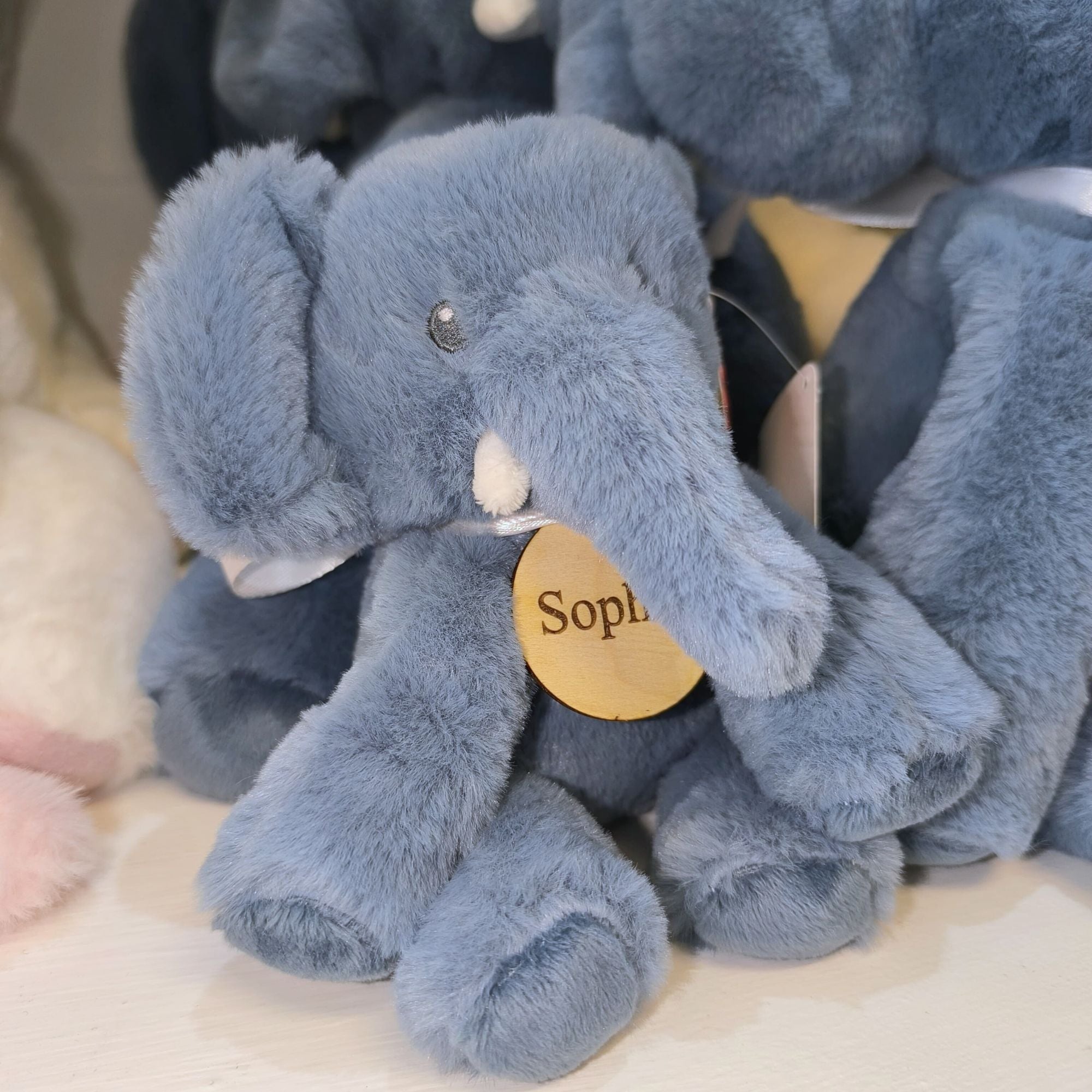 We can make your personalised Elephant even more unique by adding a charming wooden disc around its neck which can be laser engraved with a personal message, name, or a memorable date, making it a truly unique gift for any newborn baby, toddler, son or daughter.