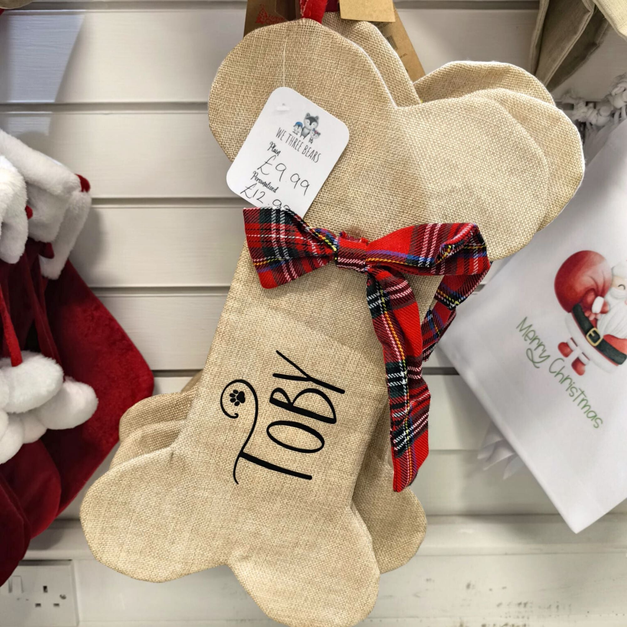 The perfect personalised stocking for dogs and puppies. Put your special furry friends presents in their very own xmas stocking this year, made extra special with their name personalised across the front of the stocking.
