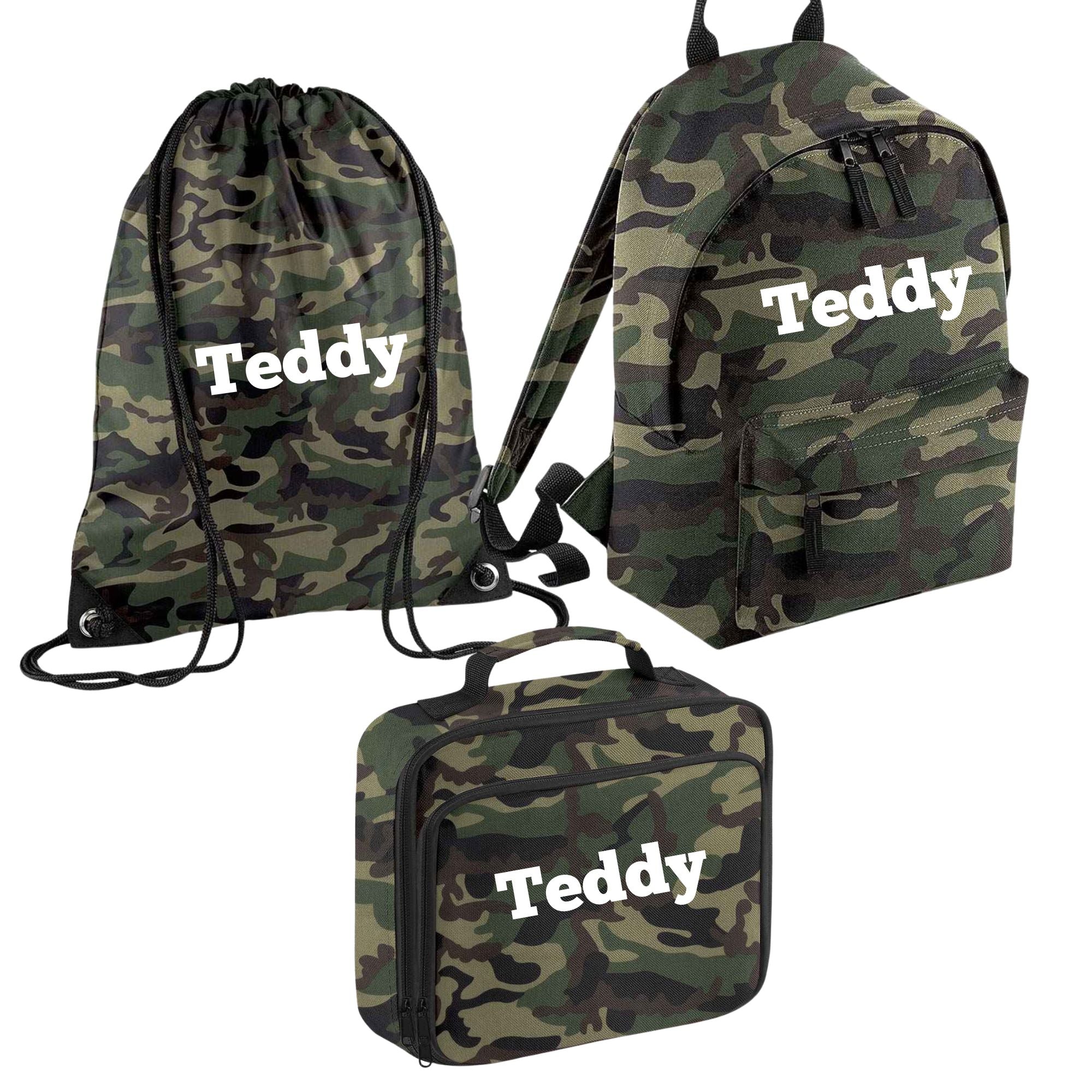 Get ready for going back to school, starting nursery or for when your children need new school accessories.  Our camo school bag sets can be purchased individually or together as a 3 piece set. Customised with your chosen name across the front of each piece.