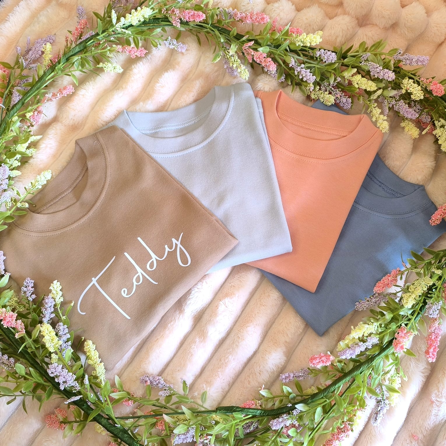 Our 100% cotton children's t-shirts are perfect for the summer and are made extra special with their name across the chest. With lots of colours available they are perfect for boys and girls.
