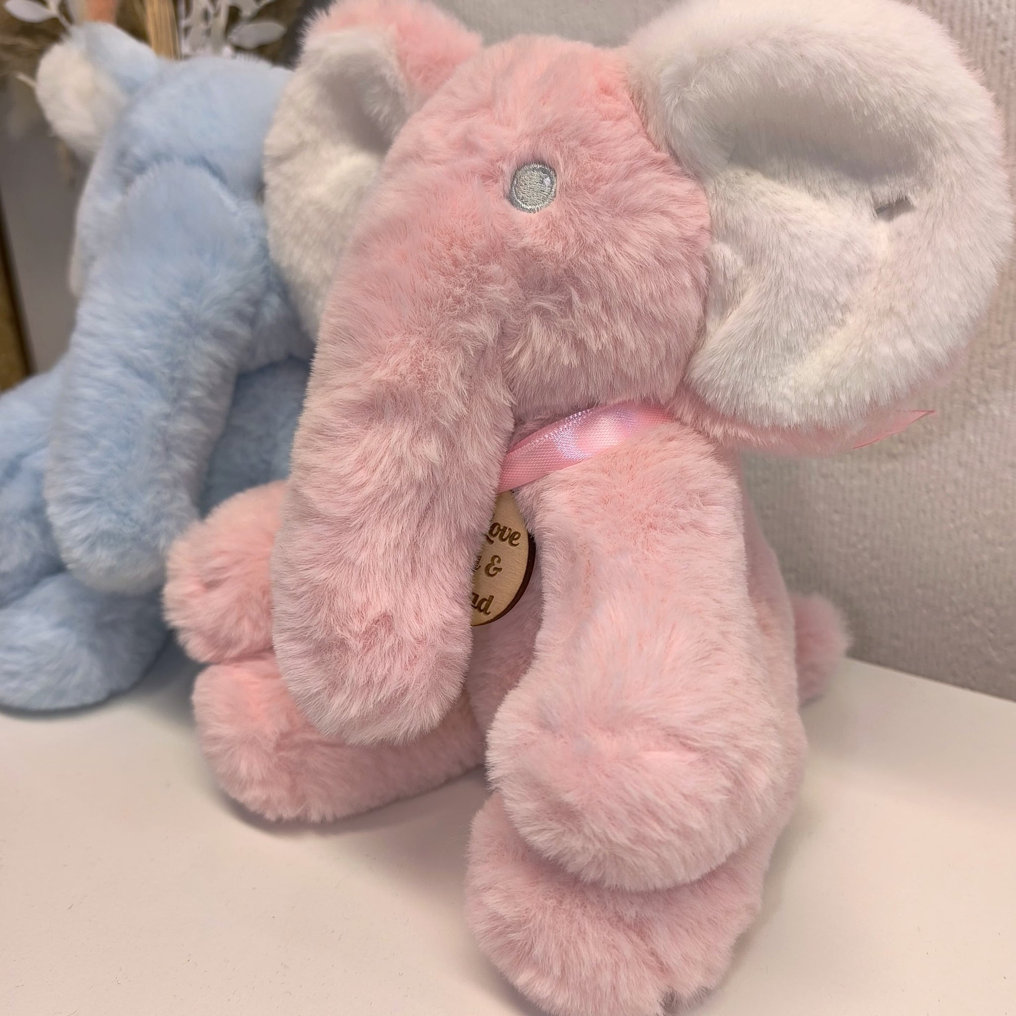 Delight your little one or a loved one with our Personalised Elephant Soft Toy from the R'Pet Pals range of soft toys. A charming gift that’s as unique as the child who receives it. This adorable elephant features a beautifully engraved wooden tag around its neck, personalised with your choice of text, finished with a tied ribbon bow in either pink or blue.