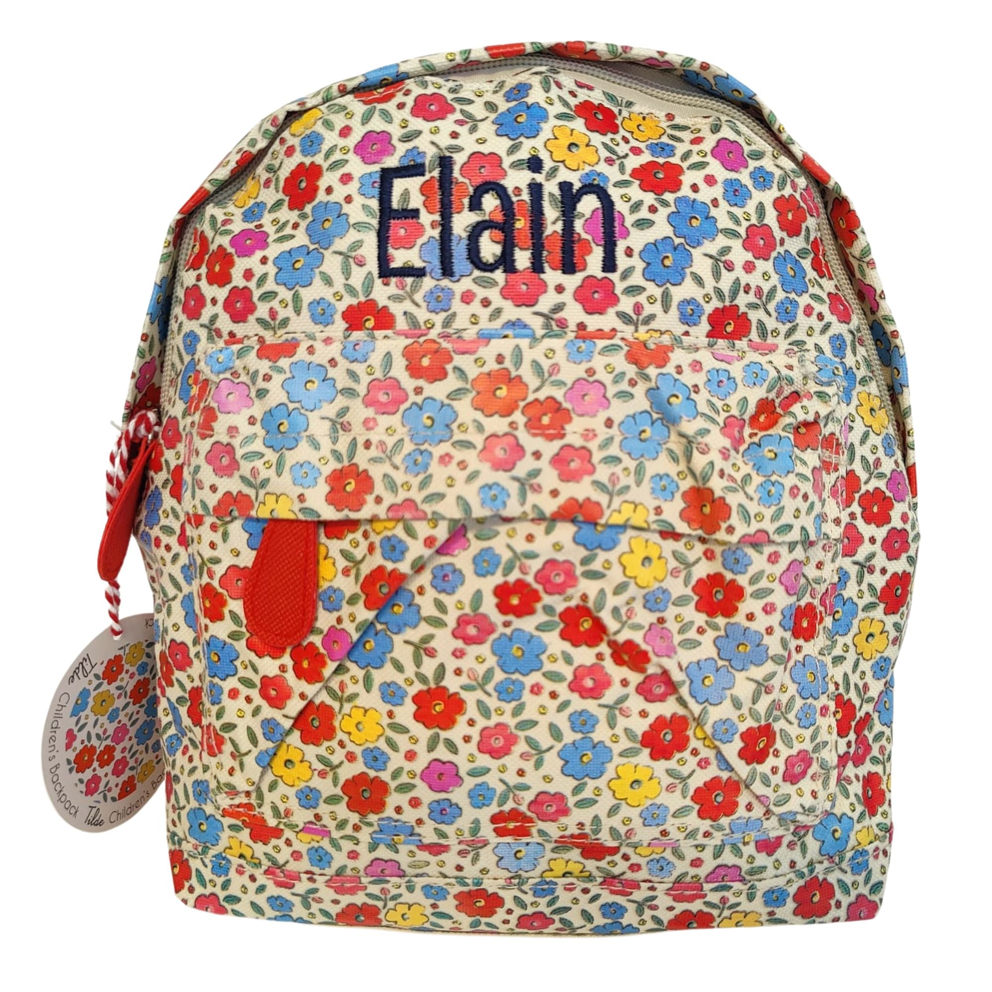 A personalised mini backpack girls featuring a colourful floral pattern and embroidered name. This mini backpack is perfect for all toddlers to use for nursery or school. Children like to keep all their little toys, snacks and random things in their backpack to take out and about with them.