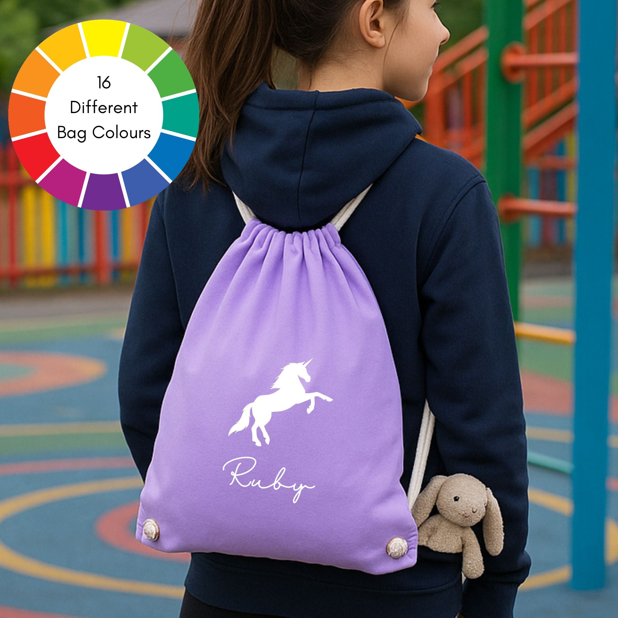 Our personalised girls drawstring bags are perfect to use as a school pe bag, for football, rugby, swimming or gymnastics. They're also perfect for After School clubs or summer holidays.