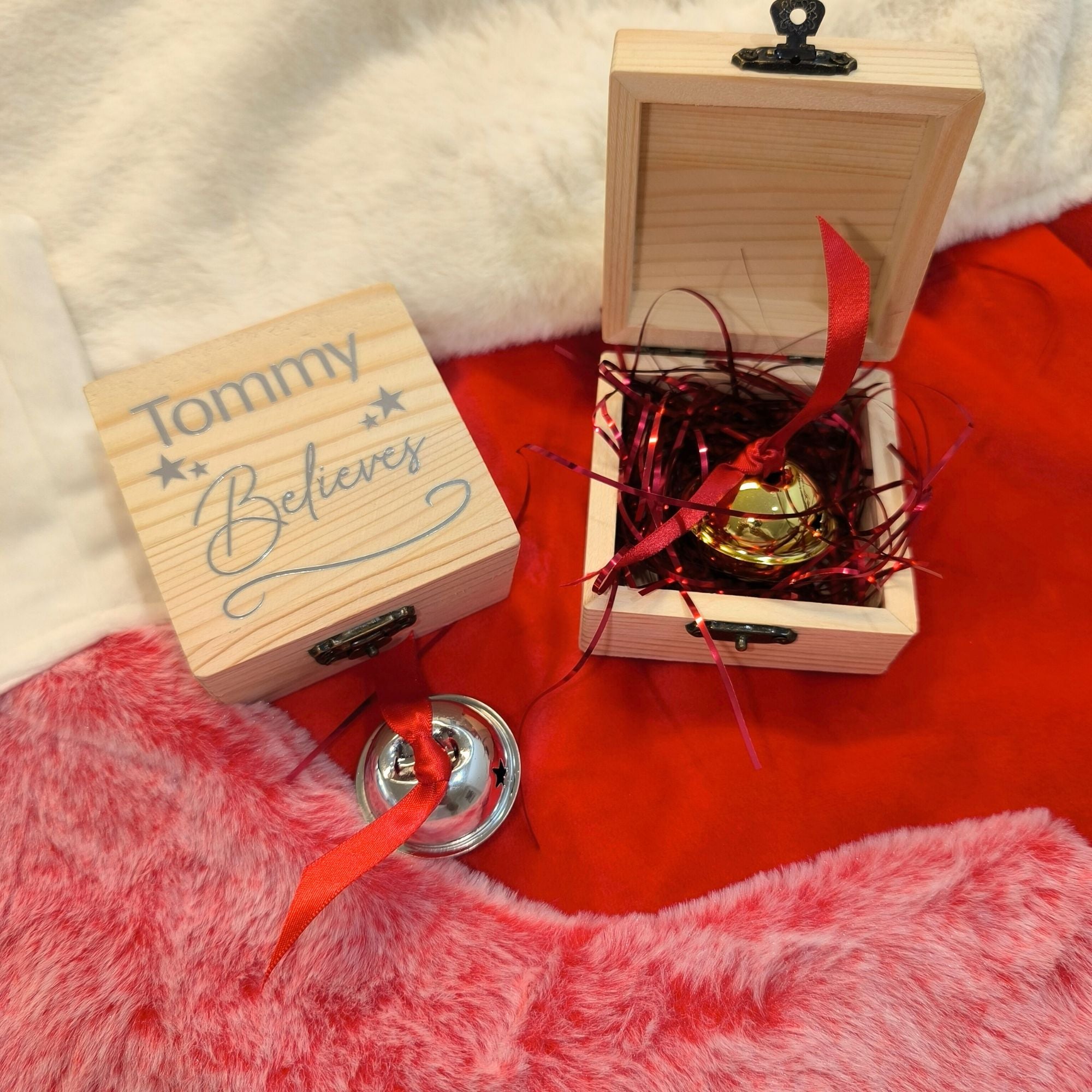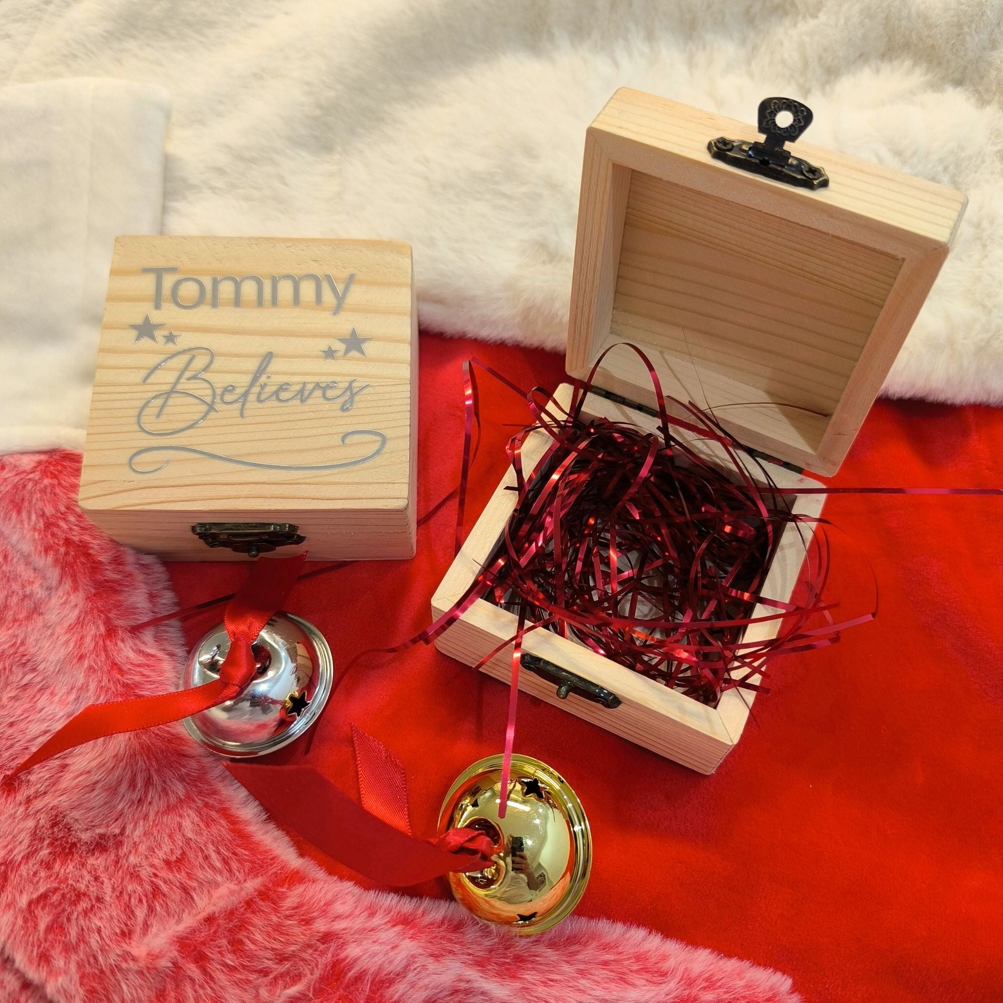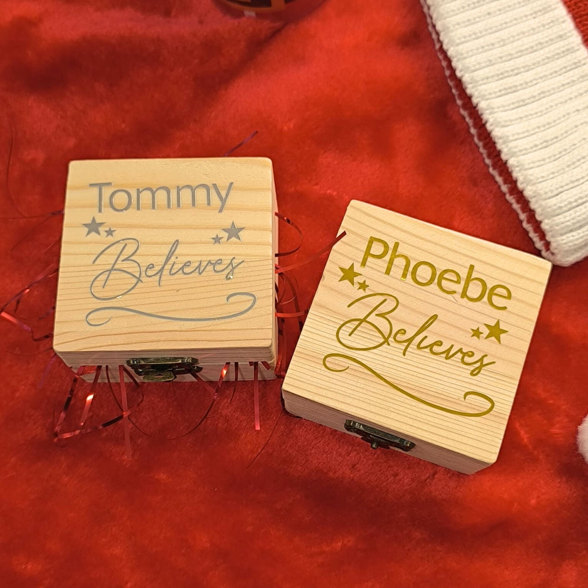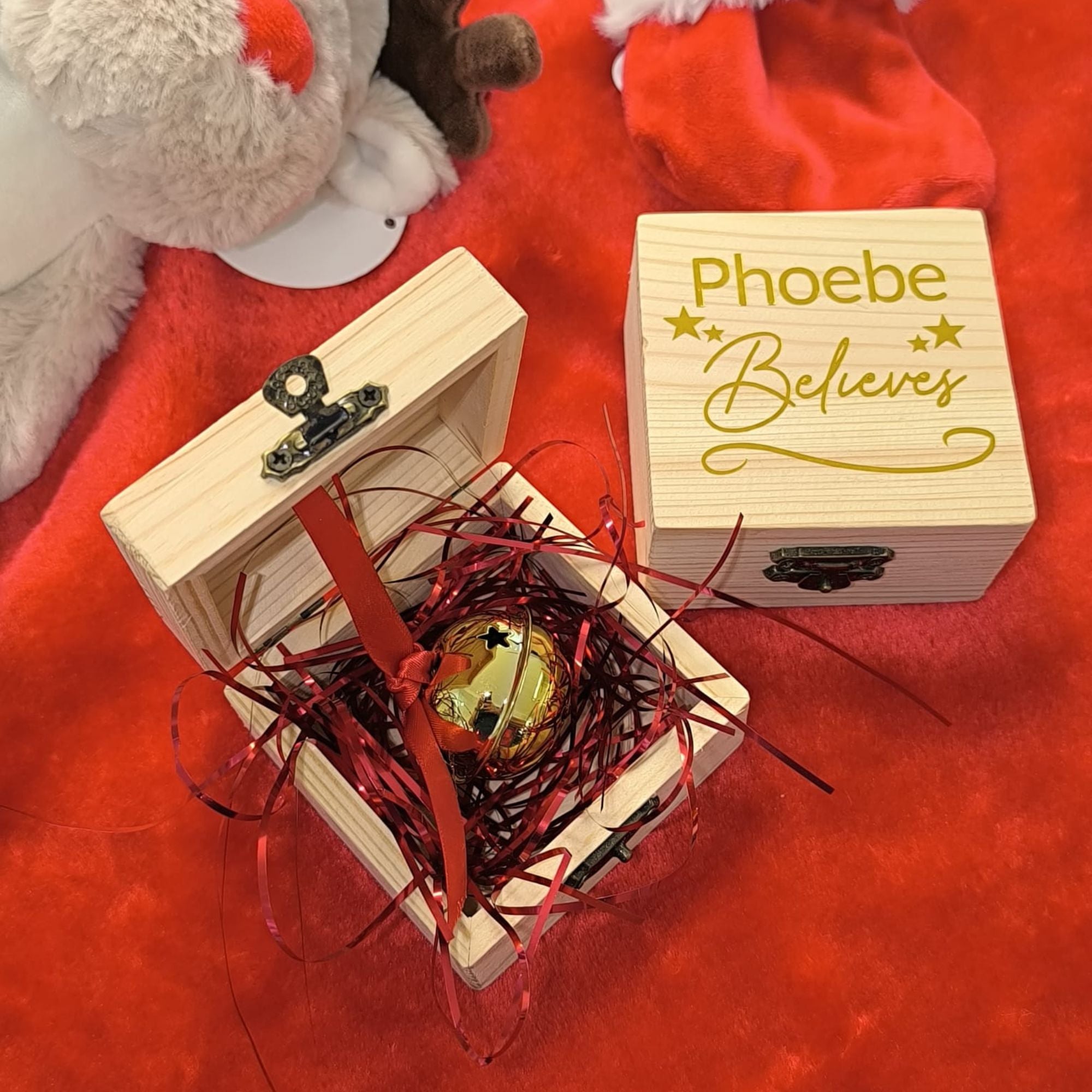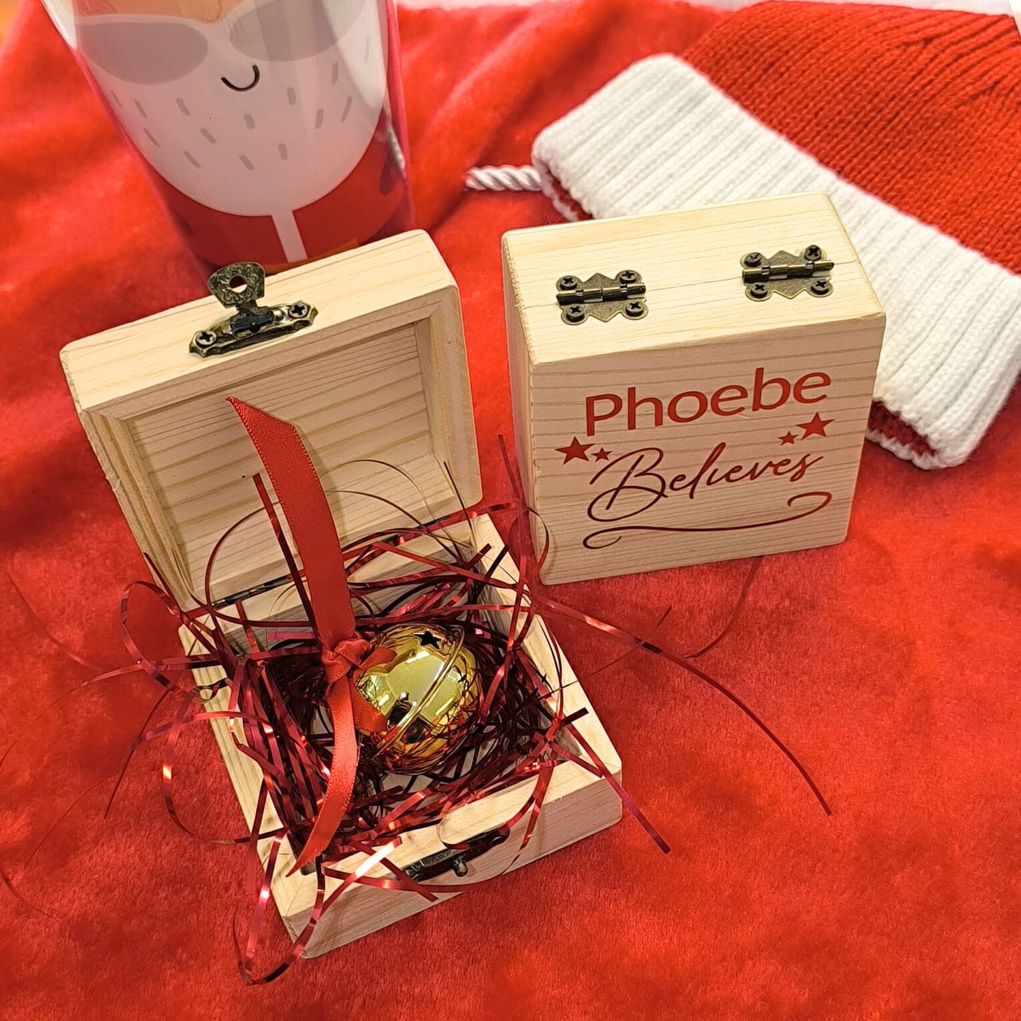 Our personalised believe bells are inspired by the Christmas film Polar Express. A beautiful wooden box is personalised with your choice of name, in your choice of vinyl colour.