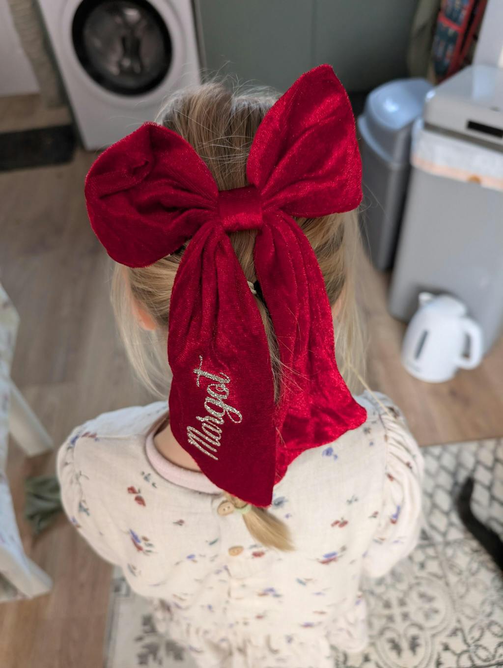 Large personalised red velvet hair bow for girls and ladies, featuring a name or initials in your choice of either vinyl or embroidery. These stocking fillers make the perfect Christmas hair bow for wearing with your Xmas outfit.