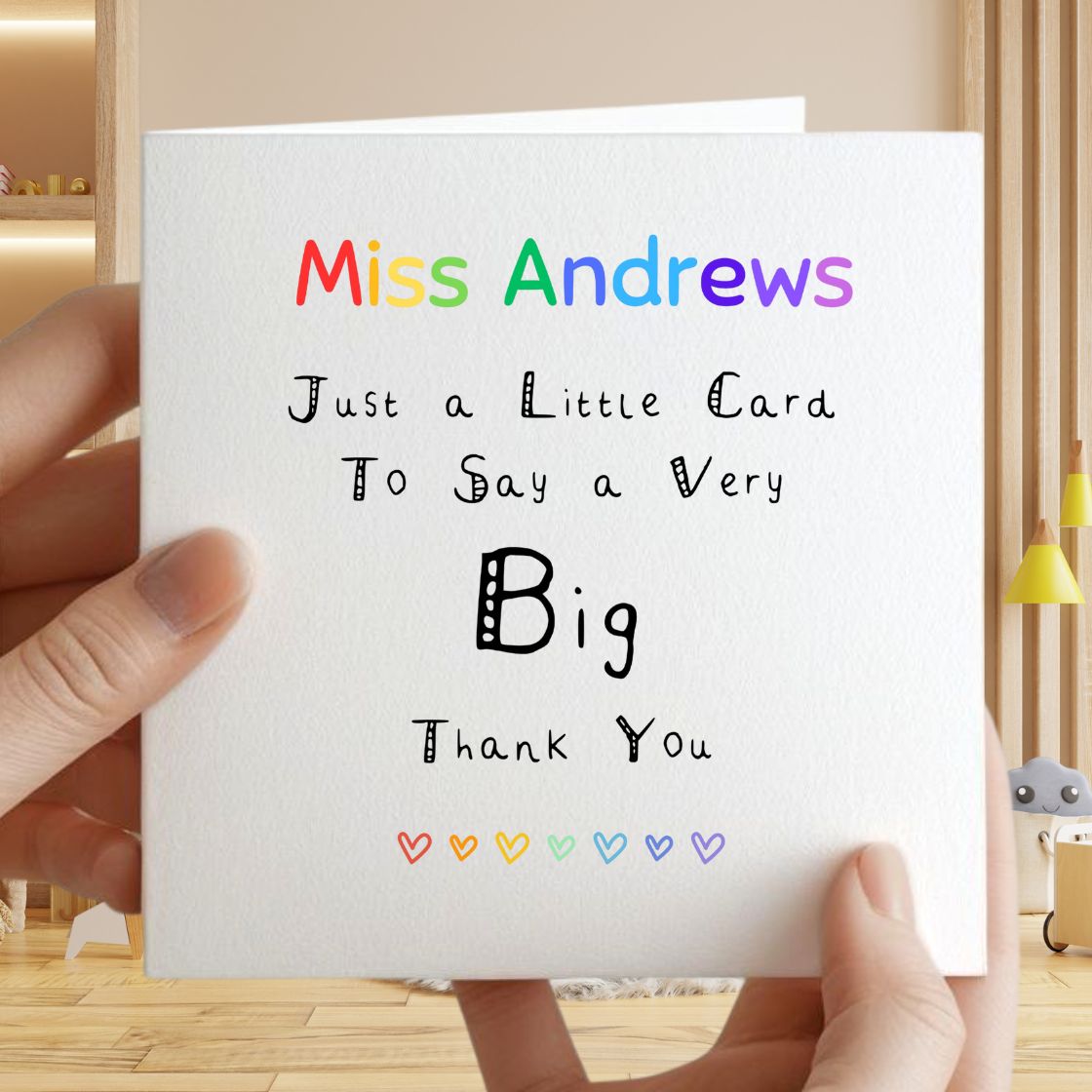 Are you looking for a perfect way to show appreciation to a special teacher? Our Personalised 'Big Thank You' Teacher Card is the perfect teacher gift to express your gratitude. Featuring a design on the front including a rainbow teachers name and text that reads 'Just a little card to say a big thank you'