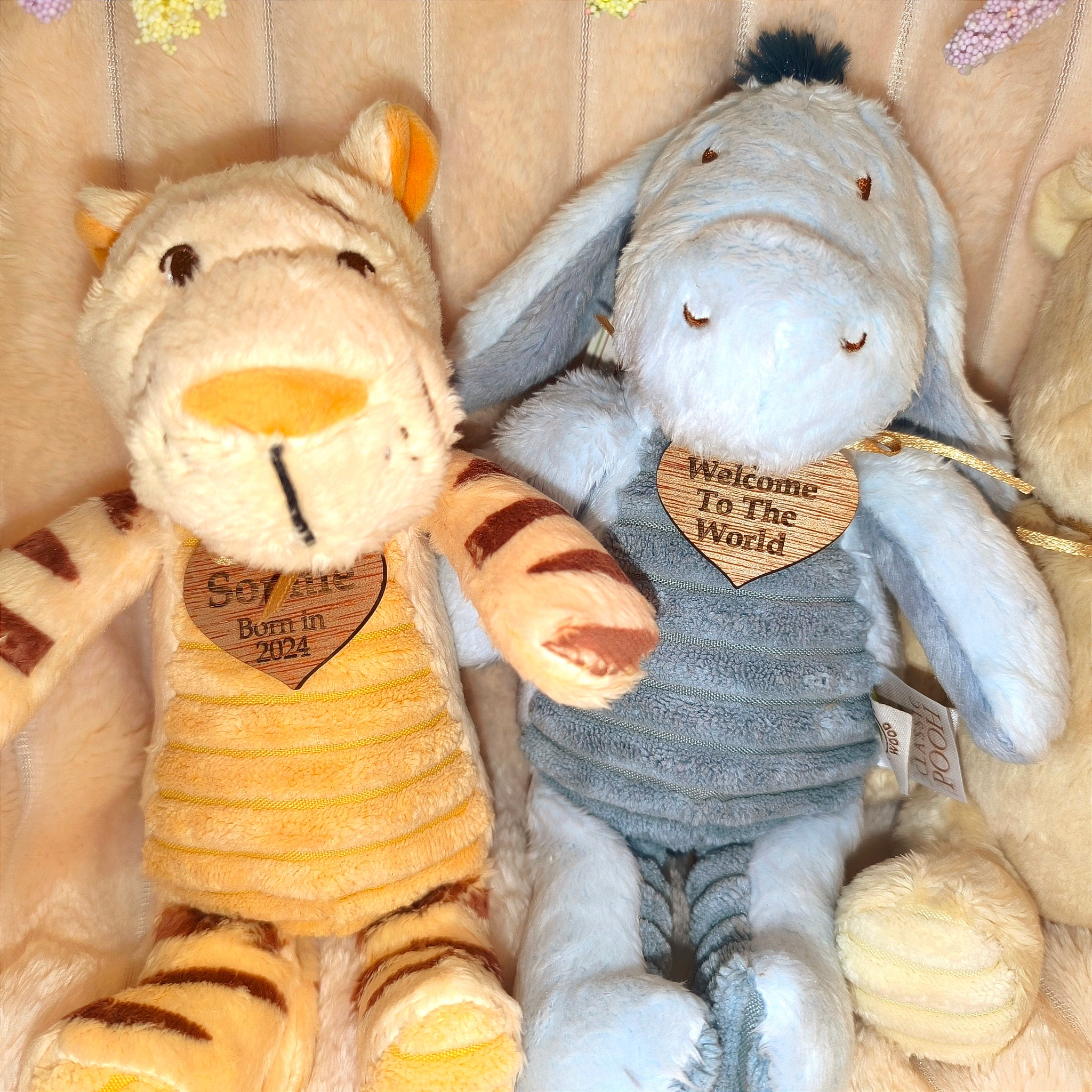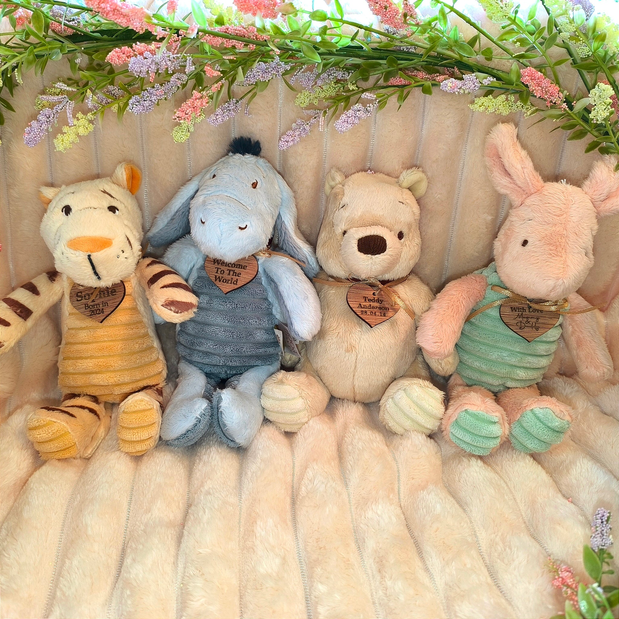 Every Winnie the Pooh or friend comes with a charming wooden heart tied around the neck in a gold ribbon. This heart can be laser engraved with a custom message, name, or date of birth, making each toy truly one-of-a-kind. The Personalised Winnie the Pooh soft toy measures 20cm, while Tigger, Piglet, and Eeyore each measure 23cm. These plushies are perfectly sized for little hands to hold and cuddle.