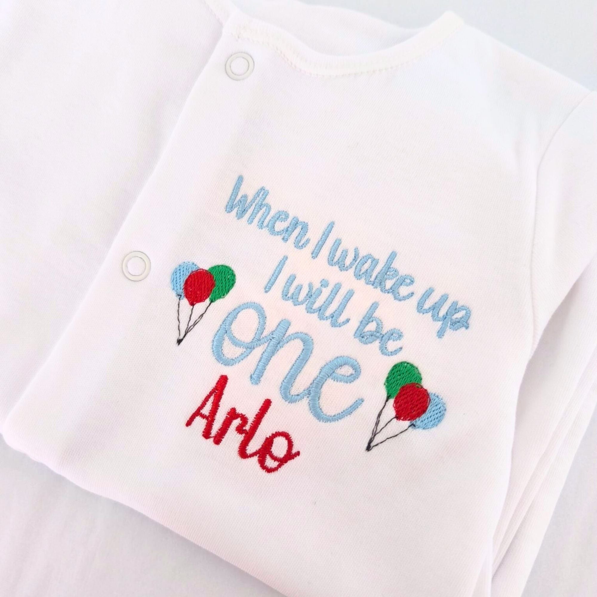 Our sleepsuits are beautifully embroidered with the phrase "When I wake up I will be One". You can choose the colour of the text, along with 3 balloon colours. This customisation ensures that your baby's outfit is as unique as they are.
