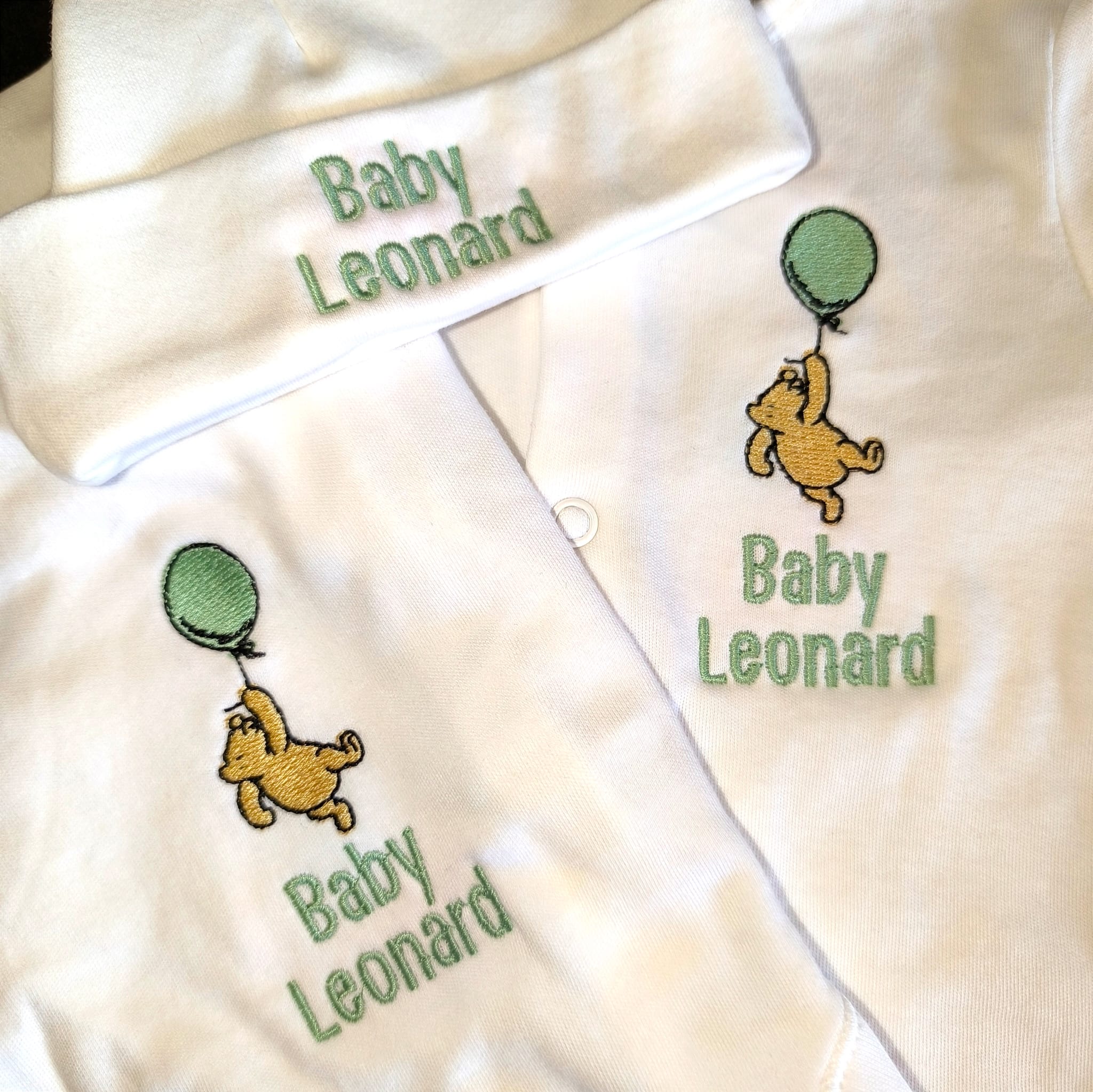 Your personalised sleepsuit features a beautifully embroidered Winnie the Pooh design of him with a balloon that adds a playful and vibrant touch to your baby's wardrobe. Our Pooh Bear design is adorable, will make everyone smile, exactly what a new bundle of joy brings us.